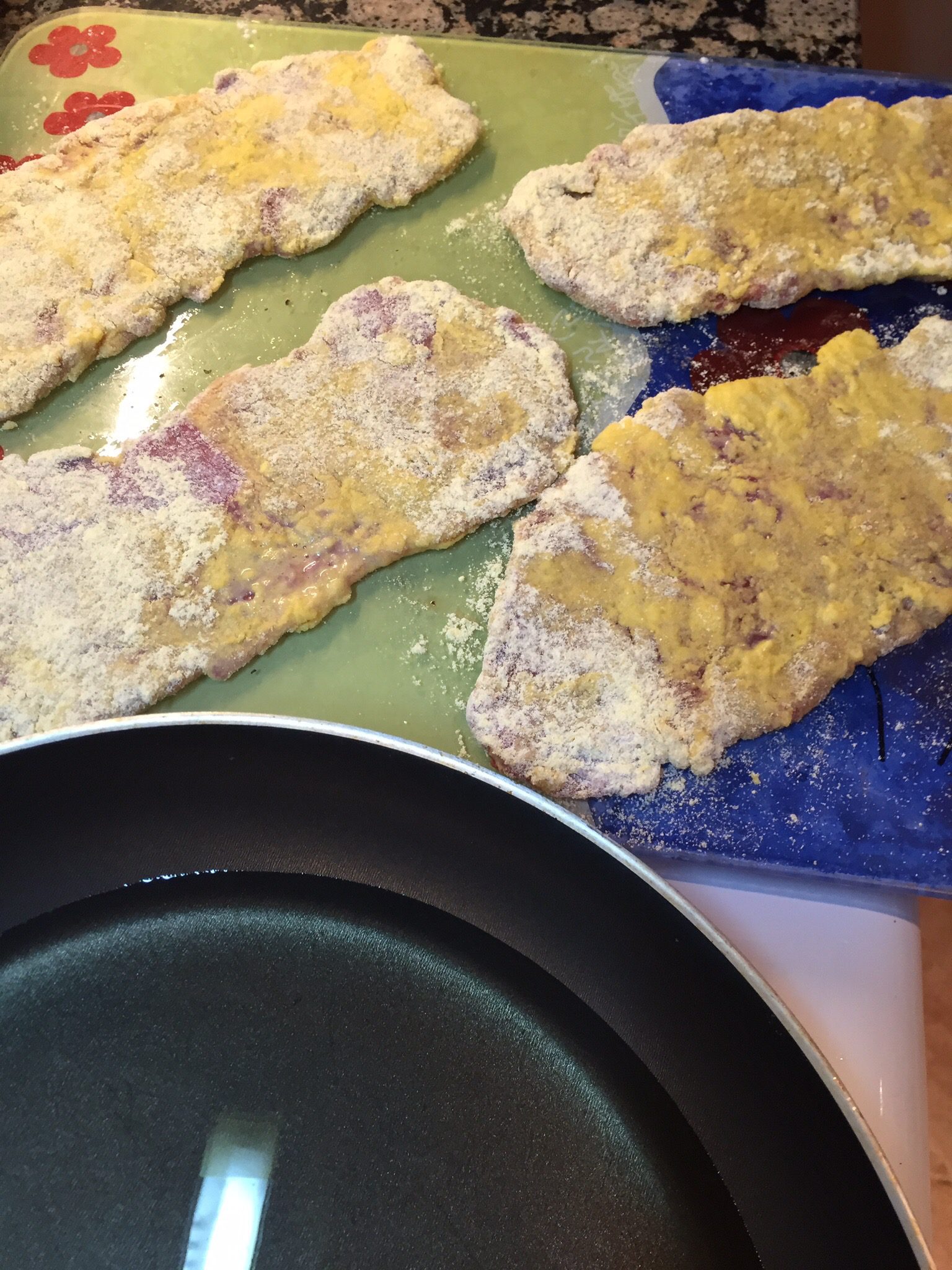 Etlerin veya tavukların iki yüzünü de tuz ve karabiberi serperek baharatlayalım. Üç ayrı çukur tabağa unları ve sütle çırpılmış yumurtayı koyalım. Önce una bastırarak ve her yerine değdiğine emin olarak bulayalım, fazlalığı silkeler gibi yaparak yumurtaya bulayalım ve en son mısır ununa bastırarak kaplayalım. Kızartma yağını ısıtmadan hepsini hazırlayalım ki kızartma yaparken yağ yanmasın. Tereyağını güzel kokutsun diye koyduğumuz az yağda( bu kızartma tipinde bir yüz pişerken diğeri de yağda pişsin istemiyoruz o yüzden sığ yağda işlem yapıyoruz.) bir yüzün bize bakan kenarları güzel renk alana kadar bekleyip, sadece bir kez çevirerek kızartıyoruz. Mutfak kağıdı serilmiş bir kağıda alıyoruz. Eğer 4 kişiden fazlasına kızartıyorsak hem yağı değiştirelim hem de kızarttıklarımızı 75 C ‘a açılmış fırında bekletelim ki sıcak servis yapabilelim. Servis sırasında birer limon dilimi kullanabiliriz. Yanına patates püresi ya da haşlanıp mayonezli limonlu maydanozlu sosta yuvarlanmış patates de çok yakışır. Afiyet Olsun!